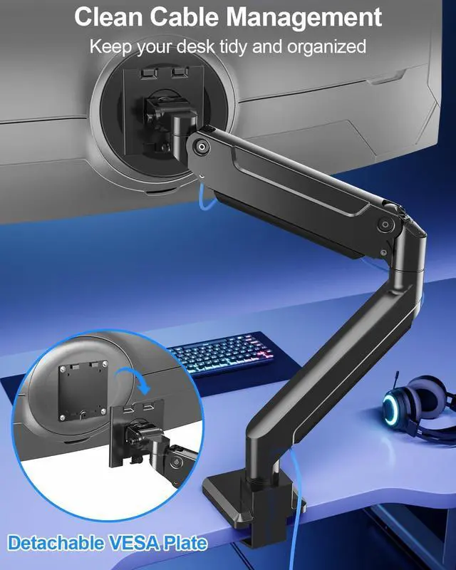 Desktop Space Saver - By mounting your monitors on our monitor desk mount, you can save over 80% of your desk space, creating a cleaner and more organized workspace. The computer monitor mount also provides top-to-bottom cable management, ensuring that you don't have to worry about messy wires. Now your workspace is neat and organized!