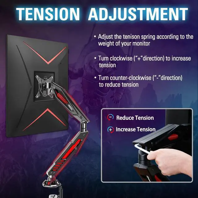 SMART APPEARANCE: This single monitor mount is specially designed for electronic sports, with its sleek technological design of the wild-style shell and an eye-catching red mechanical spring. Just explore a new visual world during the online RUSH HOUR with this innovative gaming monitor mount, and WIN IT!