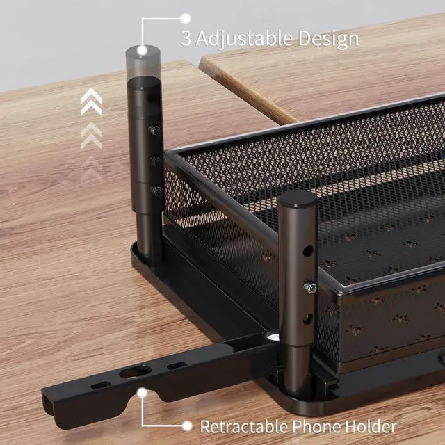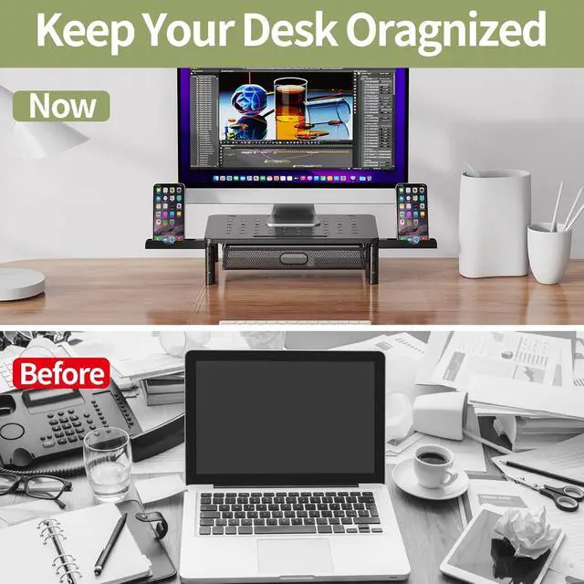 Stay Organized: Make the most of your workspace with the metal drawer and foldable phone holder. The sliding drawer is perfect for US letter-size paper, and the foldable phone holder on both sides helps you work more efficiently.