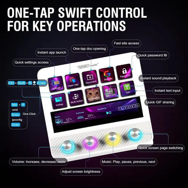 One-Touch Macro Execution & Unlimited Layout Customization: Launch system commands, web actions, apps, files/folders, text input & GIFs instantly - eliminate repetitive tasks with a single press. GIF-supported icons, unrestricted scene pages, 10 LCD keys, 4 knobs (with touch displays) & editable TouchBar per scene.