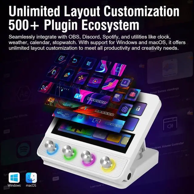 500+ Plugin Ecosystem: Seamlessly integrate with OBS, Discord, Spotify, plus utilities (clock, weather, calendar, stopwatch) for all productivity needs.