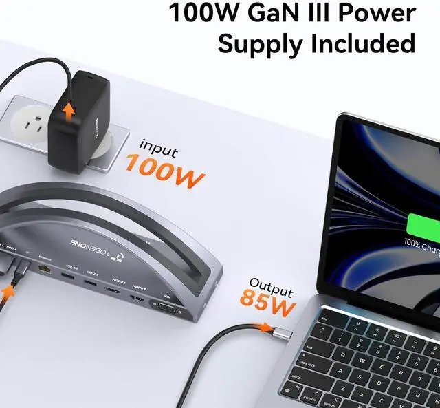 100W Power Delivery USB C Hub - TobenONE MacBook Pro docking dual monitor station supports up to 100W power input (PD3.0) and provides up to 87W charging for MacBooks. Rapidly charge your MacBook Pro/Air. Connect your MacBook Pro's power to the dock's USB-C PD3.0 charging port for stable use. Note: 100W Charger is included