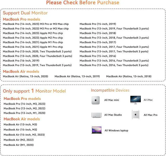 Compatible Docking Station for MacBook Pro/Air - Specifically designed for MacBook Pro 2016 - 2024 models with Intel, M1- M3 Pro/Max, including the latest M4, M4 Pro, and M4 Max chip-equipped laptops, and MacBook Air 2018 - 2025 with Intel, M1- M3 Pro/Max, M4, M4 Pro/Max. Note: For M1/M2/M3 - chip MacBooks, maximum single-screen expansion. Please verify your laptop model before purchase
