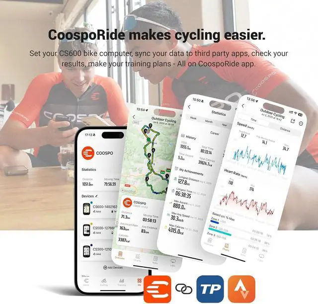 SEAMLESS WIRELESS SYNC: Easily connect to the COOSPORIDE app, Sync ride data automati cally to Strava and TrainingPeaks, create or sync custom workout plans directly to your device, with real-time prompts to hit your goals. Effortlessly share your achievements and analyze your long-term performance trends.