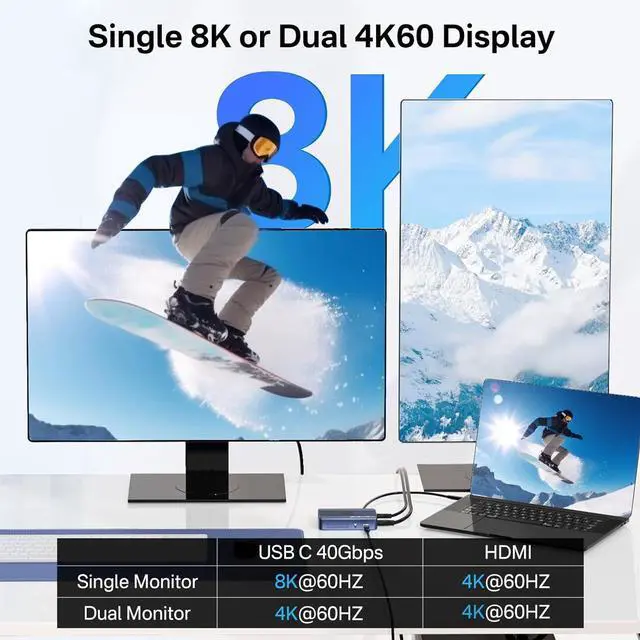 Dual Monitor DisplayExpand up to two screens with resolutions up to 8K at 60Hz for single-screen use and 4K at 60Hz for dual-screen use.