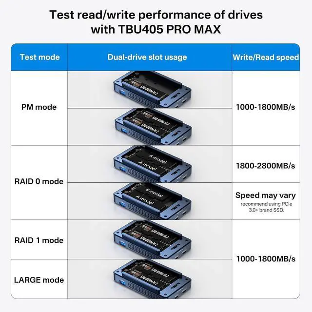 Supports software RAID ConfigurationsThis 40Gbps dual-bay enclosure supports RAID 0 (up to 2x 8TB, fast 40Gbps speed,For optimal performance, we recommend using identical drives), RAID 1 (mirrored, smallest drive capacity), JBOD (concatenated, capacity combined, macOS only). in Total, Software RAID offers flexible, cost-effective options for performance, data protection, and storage expansion.