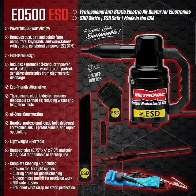 ANTI-STATIC DESIGN: ESD safe system includes grounded 3-conductor cord and wrist strap. Protects sensitive electronics during PC cleaning or repair.