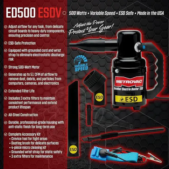 ANTI-STATIC DESIGN: ESD safe system includes grounded 3-conductor cord and wrist strap. Protects sensitive electronics during PC cleaning or repair.