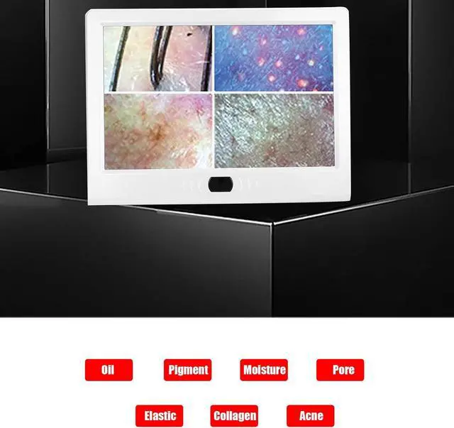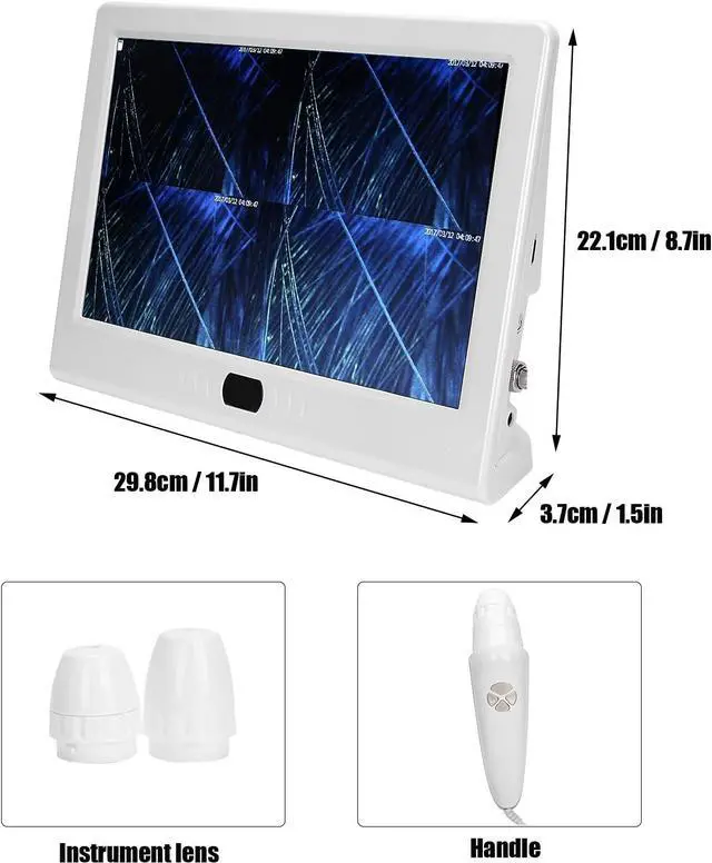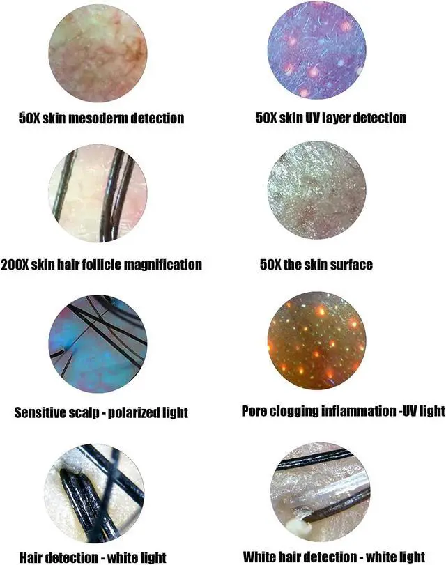 MULTIFUNCTIONSkin Microscope Has four segmentation, three segmentation, two segmentation and full screen contrast storage function. Convenient and simple operation, with 3 light modes of white light, polarized light, UV light, meeting different demands. It can be used for random skin hair scalp analysis: dry, neutral, oily, damaged hair, hair scales, healthy, luster, split, damaged hair, white hair.