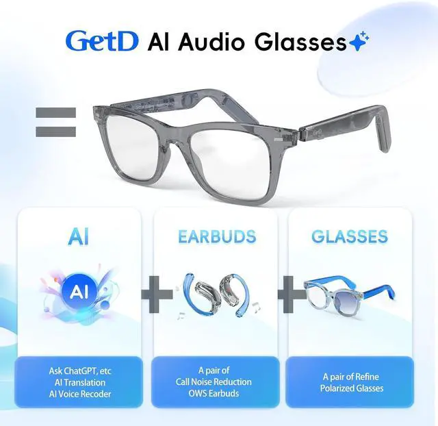 3-IN-1 AI GLASSES: Your AI Assistant powered by ChatGPT, Real-time Translation and Voice Recorder; A Pair of Good OWS Noise Reduction Earbuds; A Pair of Good Polarized Sunglasses for Men & Women
