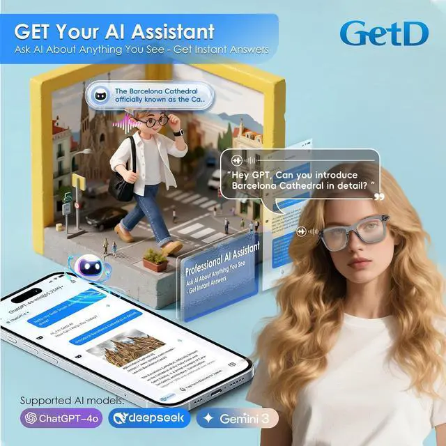 AI ASSISTANT GLASSES: Integrated into the GetD app, come with an AI assistant powered by ChatGPT, DeepSeek etc. offering intelligent, accurate, and efficient conversations; It supports High-Precision 147 languages Bi-directional Simultaneous Translation in over 170 countries, Moreover, Voice Recorder quickly converts speech to text with high accuracy meeting notes. Its also great for quick memos and recordings