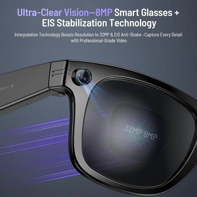 4K HD CAMERA SMART GLASSES Equipped with an 8-megapixel HD lens and a three-axis anti-shake sensor, they can take clear photos and 4K videos to capture every wonderful moment. They also have a recording function. These blue light smart glasses support fast Wi-Fi transmission and are suitable for meetings, lectures or travel.