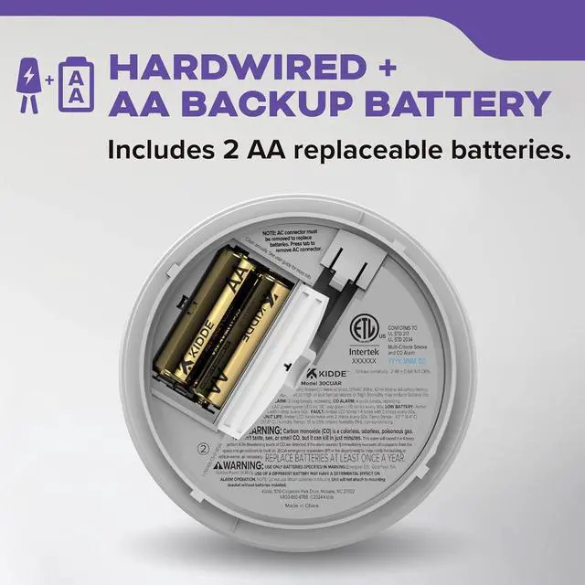 HARDWIRED & 2 AA BATTERY BACKUP (Included): Operates on 120V AC wiring (installed in the ceiling) with 2 AA alkaline batteries that provide battery backup coverage during power outages.