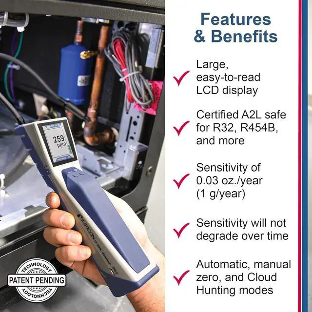 • Detects all CFCs, HCFCs, HFCs, HFOs and CO2 (Requires CO2 sensor, sold separately)