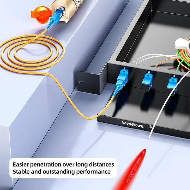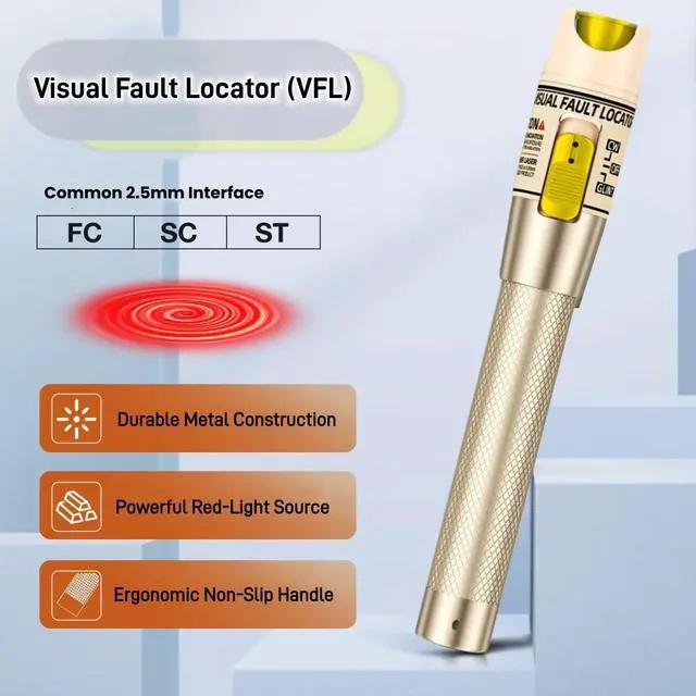 High Efficiency Visual Fault LocatorEasy identification of fiber breakpoints, poor connections, bending or cracking. Excellent for finding the right fiber to splice or quickly finding a break. Our VFL fiber optic is used for fiber tracing, fiber routing and continuity checking efficiently. It will create a bright glow around a break or fault barrier area in the fiber.