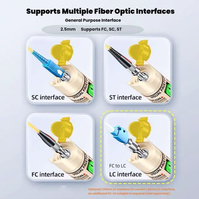 Widely Used2.5mm Universal Connector - the connector of this fiber tester is compatibly designed for ST, SC, FC, LC interferes both in the circle and square shape of different fiber optic cables. It can be used for CATV telecommunications engineering maintenance, integrated wiring system optical fiber engineering, optical device production and research, optical telecommunications, optical measurement drive engineering, etc.