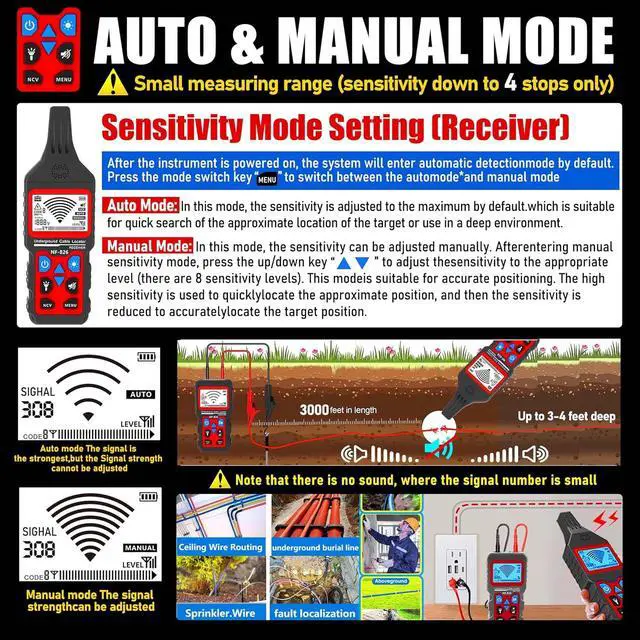 EXTRA LONG DETECTION RANGE, DEPTH PENETRATION 3000 FEET TRACKING DEPTH: The NOYAFA NF-826 Pet Dog Invisible Fence Locator's ultra-long tracking range and up to 4 feet of depth tracking capability make it the most reliable cable and pipeline wire detection tool available. Its depth and range make it possible to quickly identify the source of the problem even in complex underground power grids and in-wall pipe wiring project systems. The manual sensitivity adjustment function further enhances its ability to adapt to different environments, buried detector whether it is for home use or large-scale industrial projects, the NF-826 can provide accurate and stable detection results