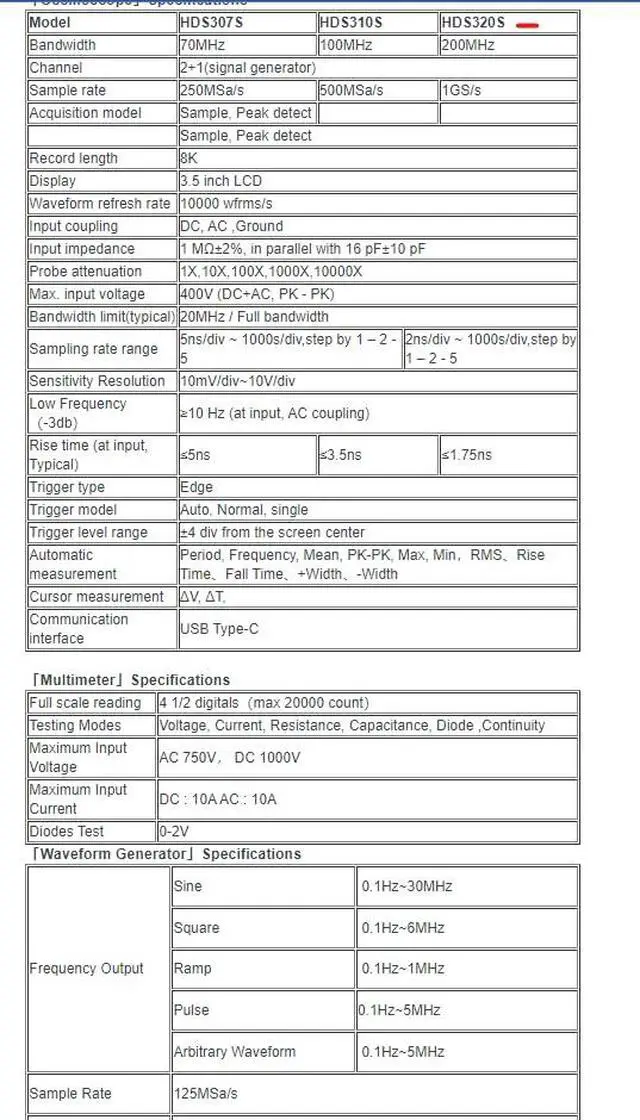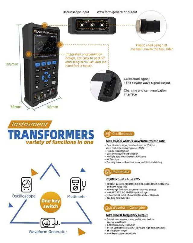 OWON HDS320S 3.5" LCD Display oscilloscope+multimeter+Generator 3 in 1 200MHz 1GSa/s 4 1/2 Digits Max 30MHz Handeld Digital Oscilloscope
