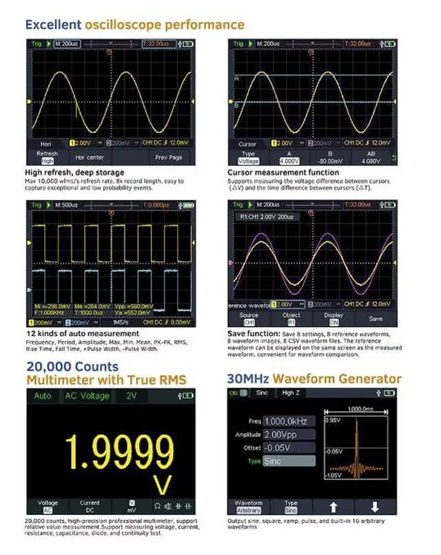 • High Resolution: Features a 320x240 pixel TFT LCD display for clear and detailed waveform visualization.