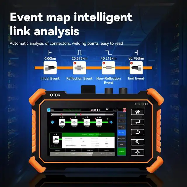 Event Map & Data StorageFiber optic tools can visualize road problems and faults at a glance. Information such as the length of the fibre optic link, type of connector, fusion point or break point is presented in a graphical form that is easier to understand. Save and view the testing curves, support zoom and move curves, view details. (Event Blind Zone <1.6 m, Attenuation Blind Zone<8 m.) OTDR tester support create testing report, including curve trajectory graphs, parameter settings, fiber event information, and fiber link information.