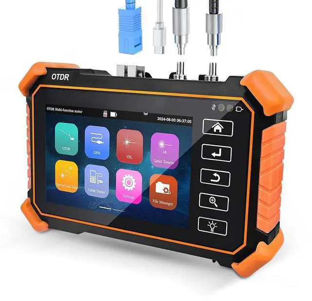 4 inches Intelligent and Multi-functional Fiber Optic Testercontaining expert OTDR, automatic OTDR, event map, 10G split-wave power meter, general optical power, end state verification, multi-core test, intelligent line diagnosis (optional), loss test, RJ45 line length/line sequence/seeking line, red light, stable light source, illumination. Touch screen and button double design, simple operation, friendly interface, is the optical cable construction installation, engineering acceptance and on-site repair of the right hand.