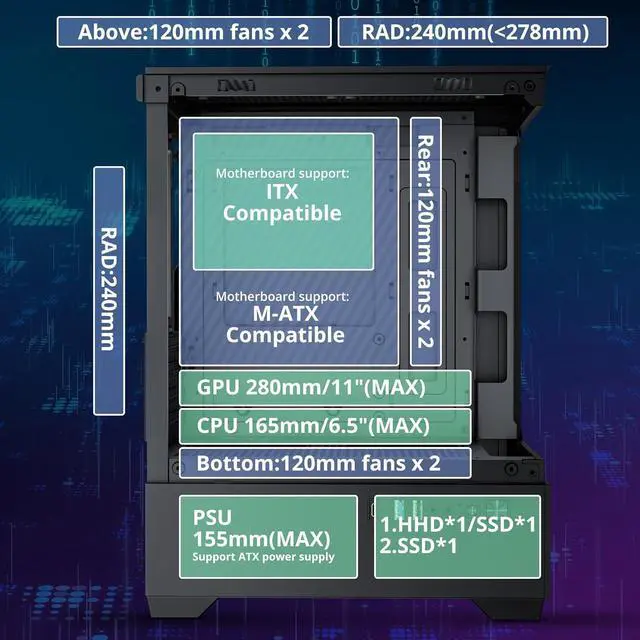 LINEDEPOT has really organized the inside of this Gaming PC Case MATX well. The installation spots are cleverly designed, ensuring no problems when installing powerful hardware. Gamers can fully enjoy building their setups as they please. It's compatible with most popular hardware, supporting 280mm (11") GPUs, 165mm tall CPU coolers, a 240mm liquid radiator on top, and 155mm (6.1") power supplies.