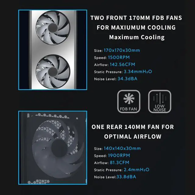 1. 5 Pre-installed Fans - Experience exceptional airflow with five pre-installed fans, including two large 170x30mm front fans, two 120mm reversed-blade fans and a 140mm fan at the rear, ensuring your CPU and GPU stay cool during intensive tasks.