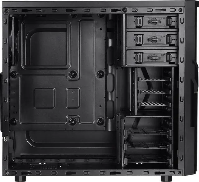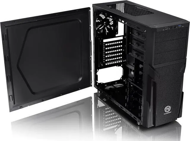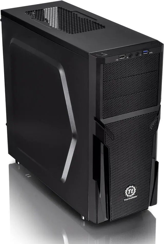 The perforated front-top panel has implemented one data transfer SuperSpeed USB 3.0 port along with one standard USB 2.0 port, a HD microphone and headset jacks, to grand direct access when needed