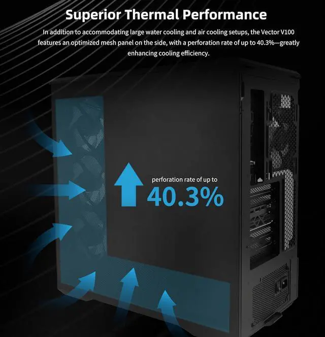 Toolless Panel Removal:Each side panel features a tool-less mounting mechanism for easy and fast access to internal components, streamlining your build process.