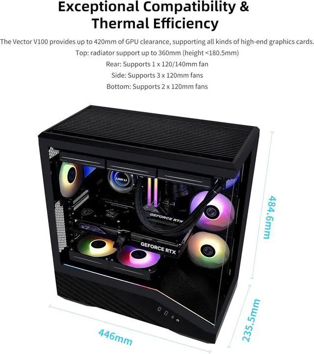 V100 ATX Mid-Tower PC Case, 4 x 120mm ARGB PWM Fans Pre-Installed, LED RGB Strip, Display Platform with Tempered Glass, Support 420mm GPUs, 360mm Radiator, Optimized Airflow - Black (V100RX)