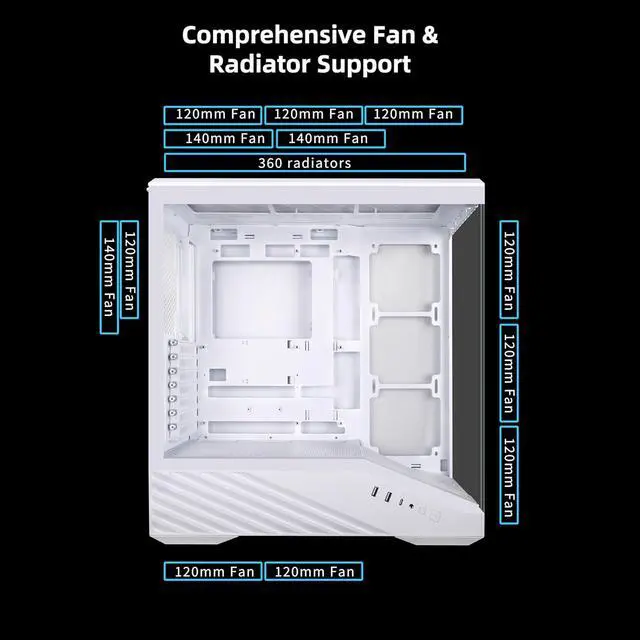 Pre-installed 4 Fans:Comes with 4x pre-installed PWM-controlled 120mm ARGB fans, ensuring adaptable airflow and vibrant lighting with daisy-chain connectivity for easy setup. Fan Speed: 1800 RPM - Max. Fan Airflow: 61.47-60.4 CFM - Max. Fan Air Pressure: 2.54-2.17 mm-H2O - Fan Noise Level: 26.5-30.8 dBA - Fan Bearing: Hydraulic bearing