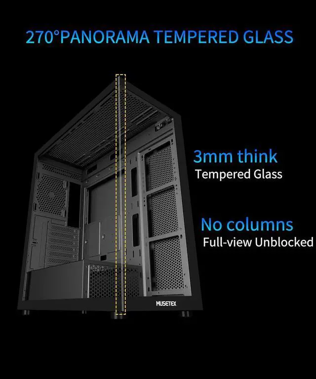 1. MUSETEX brings you gaming computer case K2,both a visual experience and a first-class installation experience,high configuration,high cost performance. Pc case pre-install 6 PWM ARGB fans,strong cooling performance; Large case installation space; The 270° fully transparent dual tempered glass panel, a wider field of view and better than most of same cases on market, can display users' high-end and cool PC hardware and beloved dolls, and will gain friends' cool admiration!