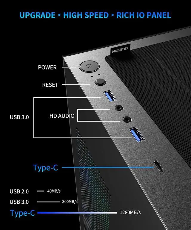 3. Upgrade High Speed IO Panel - MUSETEX PC case is rich in external interfaces to increase the cost, configured with 2 USB 3.0 and TYPE-C high speed interfaces to facilitate the connection of various new standard devices, enjoy higher transfer rates and save waiting time; enjoy the wonderful experience brought by higher power supply. The Reset button and AUDIO interface are fully configured to meet the multi-functional needs of daily office and gaming