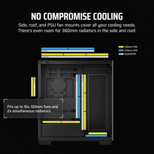 Fits Multiple 360mm Radiators: Mount radiators up to 280mm and 360mm in the roof and 360mm in the side to support liquid cooling.