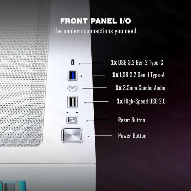 Upgrade High Speed I/O PanelKEDIERS PC case is rich in external interfaces to increase the cost, configured with USB3.2 Gen 2 TYPE-C high speed interfaces to facilitate the connection of various new standard devices, enjoy higher transfer rates and save waiting time; enjoy the wonderful experience brought by higher power supply. The Reset button and AUDIO interface are fully configured to meet the multi-functional needs of daily office and gaming.