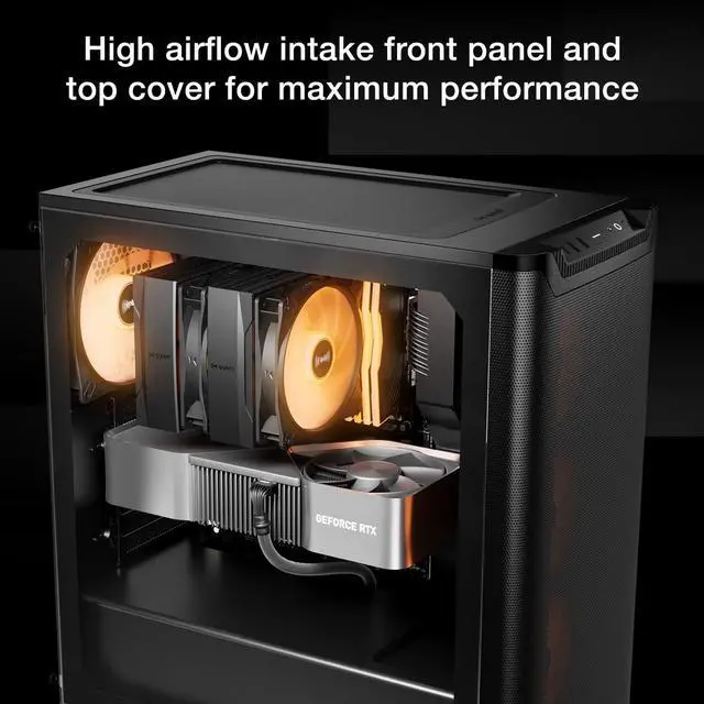 Despite its compact dimensions, Pure Base 501 offers enough space for high-end graphics cards and large coolers. Triple fans or a radiator up to 360mm can be installed easily at the front, while top area provides space for up to 3 fans or a radiator up to 240mm.