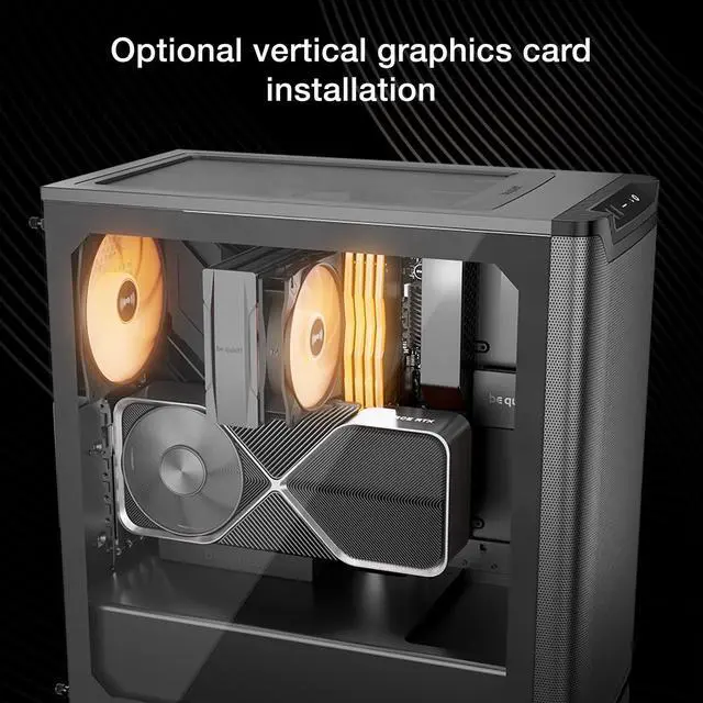 Why not try something else with your GPU? The PCIe slots of the Pure Base 501 can be rotated 90° for an upright installation of wide high-end graphics cards. The spacing is perfect for the optional be quiet! Riser Cable, whose foam base provides excellent anti-sag support for graphics cards in vertical orientation.