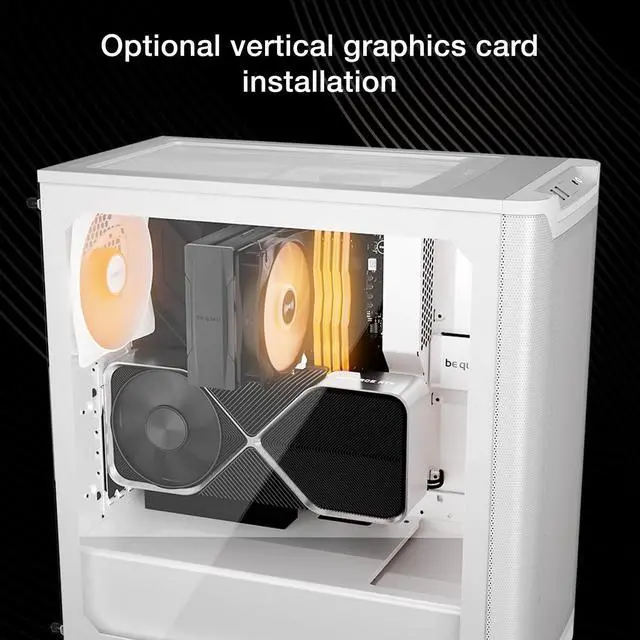 Why not try something else with your GPU? The PCIe slots of the Pure Base 501 can be rotated 90° for an upright installation of wide high-end graphics cards. The spacing is perfect for the optional be quiet! Riser Cable, whose foam base provides excellent anti-sag support for graphics cards in vertical orientation.
