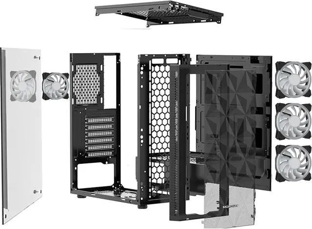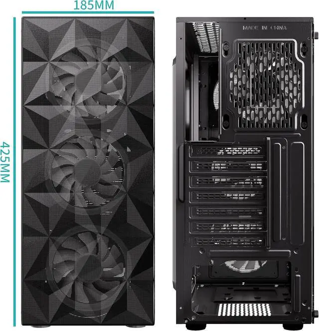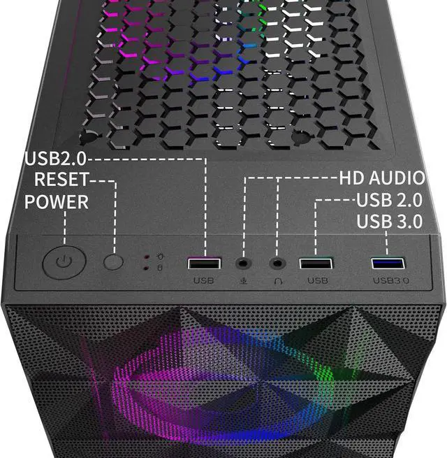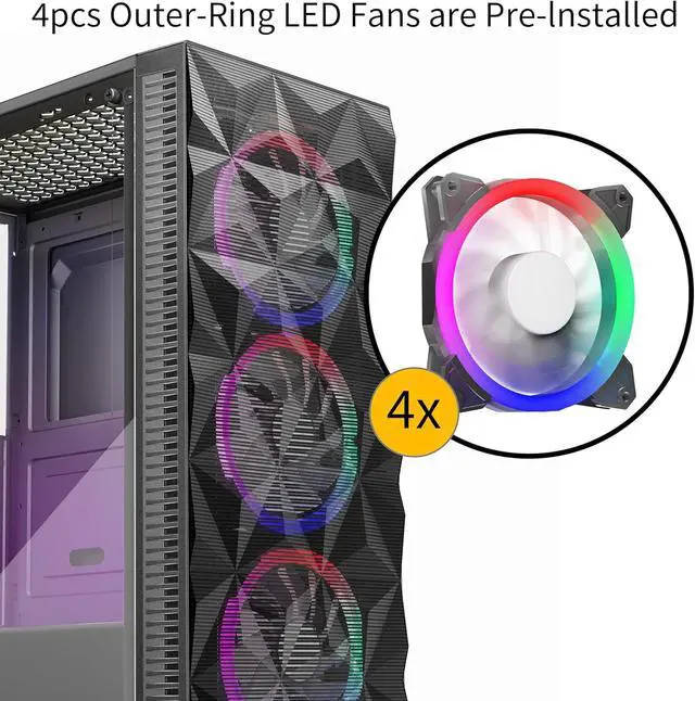 Perfect Airflow - The diamond mesh front panel of this atx pc case is the optimal cooling performance panel that features a stereo contour. While this pc case with fans can provide amazingly high airflow, it can also showcase great lighting effects. So you don't have to worry about the heat dissipation during the operation of the pc tower case and enjoy it wantonly.