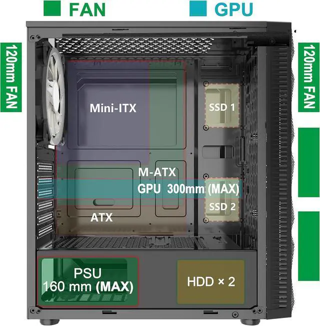 Precise Design - Morovol 621-N4 computer tower case supports ATX / Micro-ATX / Mini-ITX, the GPU is up to 300mm, the PSU is up to 160mm and the CPU cooling height is up to 155mm. In addition, this black pc case can support to install 2 x 2.5 "SSDs + 2 x 3.5" HDDs.