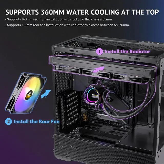 Supports simultaneous installation of Front 360mm radiator + Top 360mm radiator or Front 420mm radiator + Top 280mm radiator.