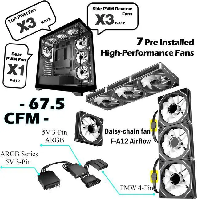 3. [7 High-Performance Fans]C9 pre-installed 3*reverse fans on the side(reverse blade fan design is not only beautiful but also help the mid tower pc case absorb air cooling),3*exhaust fans on the top and 1*exhaust fan at the rear to quickly remove heat,cooling PC components;featuring a daisy-chain design and 1-to-3 splitter for neat,simplified cable management.with motherboard synchronized lighting effects.
