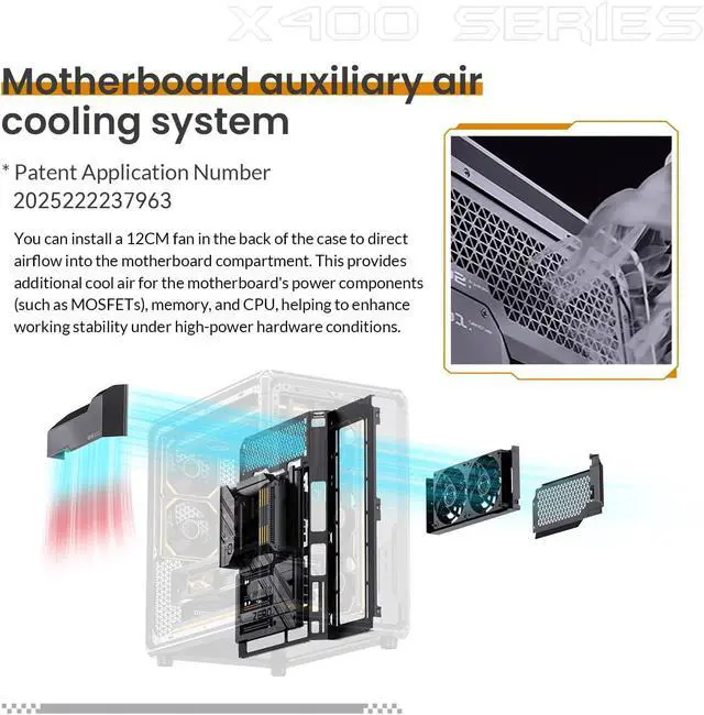 Mainboard auxiliary wind cooling system(Patent design):You can install a 12CM fan in rear to direct airflow into the motherboard compartment.