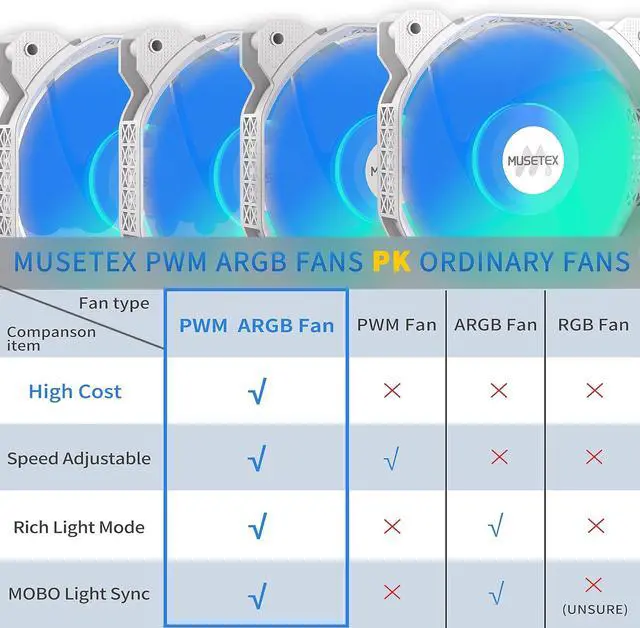 Good Heat Dissipation/Cool Effect-MUSETEX pre-installs 6 speed-adjustable ARGB fans in Y6 gaming case,which can be controlled by motherboard software, customized with various light modes for cool and colorful lighting! Fans use anti-vortex blades to ensure proper airflow; use software to control fans' speed with the stable air intake performance of side fans, fully regulate cooling effect,achieve better cooling performance than ordinary computer cases, extend the service life of the hardware!