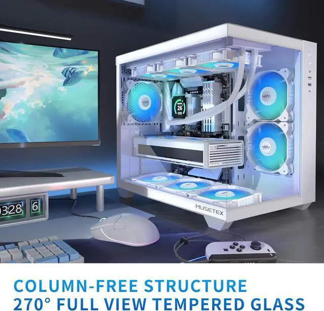 offers a great gaming pc case Y6 for visual experience and setup experience,with 6 pre-installed PWM ARGB fans, the two fans on the side adopt reverse blade design for good heat dissipation and more beauty. White pc case breaks black conventional impression, with 270° fully transparent dual tempered glass panels for a wider field of view than most of the same atx case on the market,which can display user's high end PC hardware and beloved dolls,and will harvest cool admiration from friends!