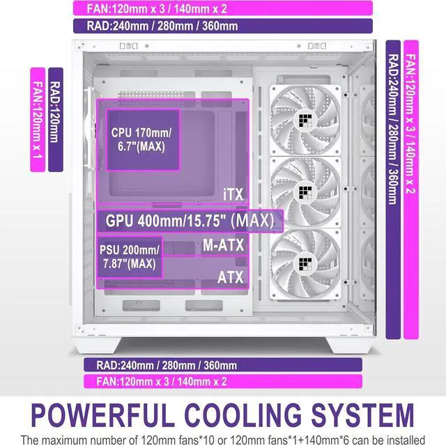 Extra Large Capacity The space in the case is configured for each component and will be fully compatible with your new computer components. (1) Support ATX/M-ATX/ITX motherboard (2) Support 360MM cooler (3) CPU cooler height 170MM (4) GPU length limit 400MM (5) Power supply type ATX up to 220MM (6) Equipped with 1* HDD and 1* SSD mount or (2* HDD) (7) Expansion slots 7+3