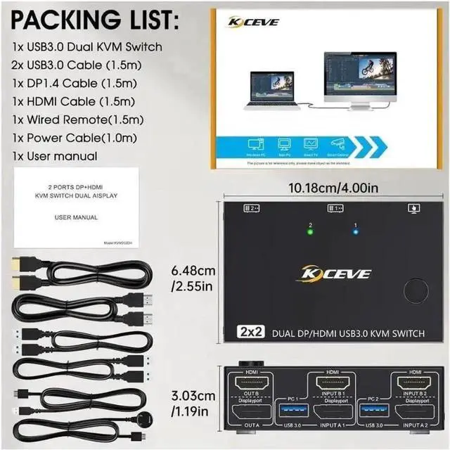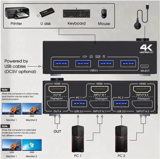 With 4 USB 3.0 ports for USB devices, the DC 5V power supply port, it is convenient for you to use high-power USB devices (such as HDD, SSD, etc. ). Usually this Dual monitor KVM switch powered by USB cables, no need to connect to DC 5V power supply.