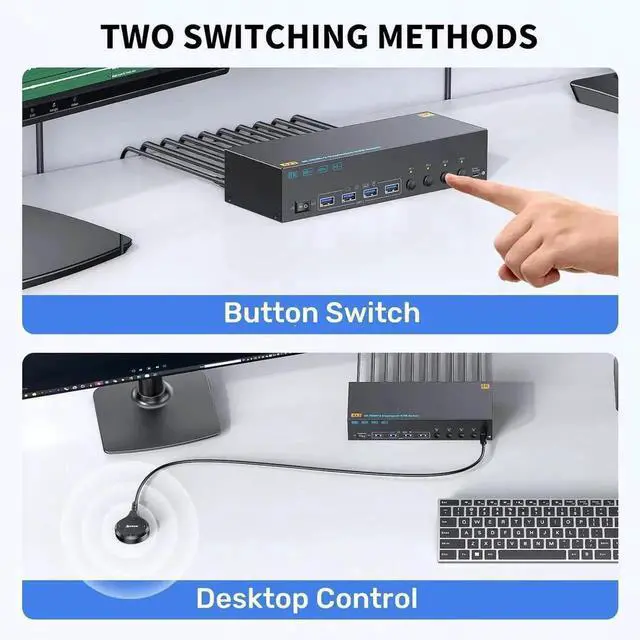 Triple Monitor KVM is an innovative 4-in-3-out KVM switch that allows 4 PCs or laptops, 3 monitors and 4 USB devices, such as keyboards, mice, printers, scanners and USB sticks. It is a perfect tool for users with 4 computers that effectively reduces clutter and maximises productivity.
