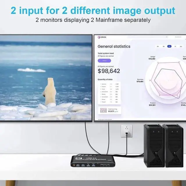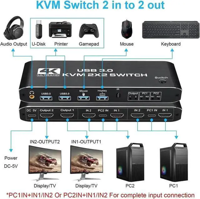2 Port KVM Switch HDMI Dual Monitor -- Consoles control up to 2 computers or laptops with 1 set of USB keyboard, mouse, and share dual monitors for extended or copy display.