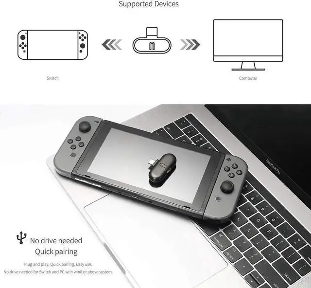 Packing list: 1x Audio Transmitter 1x Type-c cable dock adapter 1x U-type Adapter 1x Microphone gadget Connected Devices This mini size wilreless audio transceiver offer a perfect solution to enable your Switch or non-bluetooth computer connected with bluetooth Earphones/ Headphones and bluetooth Speakers. No battery and no driver needed, easy to pair with airpods, bose qc35 headphone, bose soundlink revolve etc. Support TV Dock Mode Come with a Micro to Type-c adapter. It adopts aptX LL codec to eliminate that annoying lag you may get and ensure smooth transmission with impeccable sound quality for excellent game feel either on Nintendo Switch handheld mode or TV Dock mode, wirelessly transmit audio anywhere, anytime. Working with Battery Pack Built-in smart USB PD passthrough charging technology, so you can charge Switch by original chargind adapter through the transmitter without issue. Well, it also can works together with